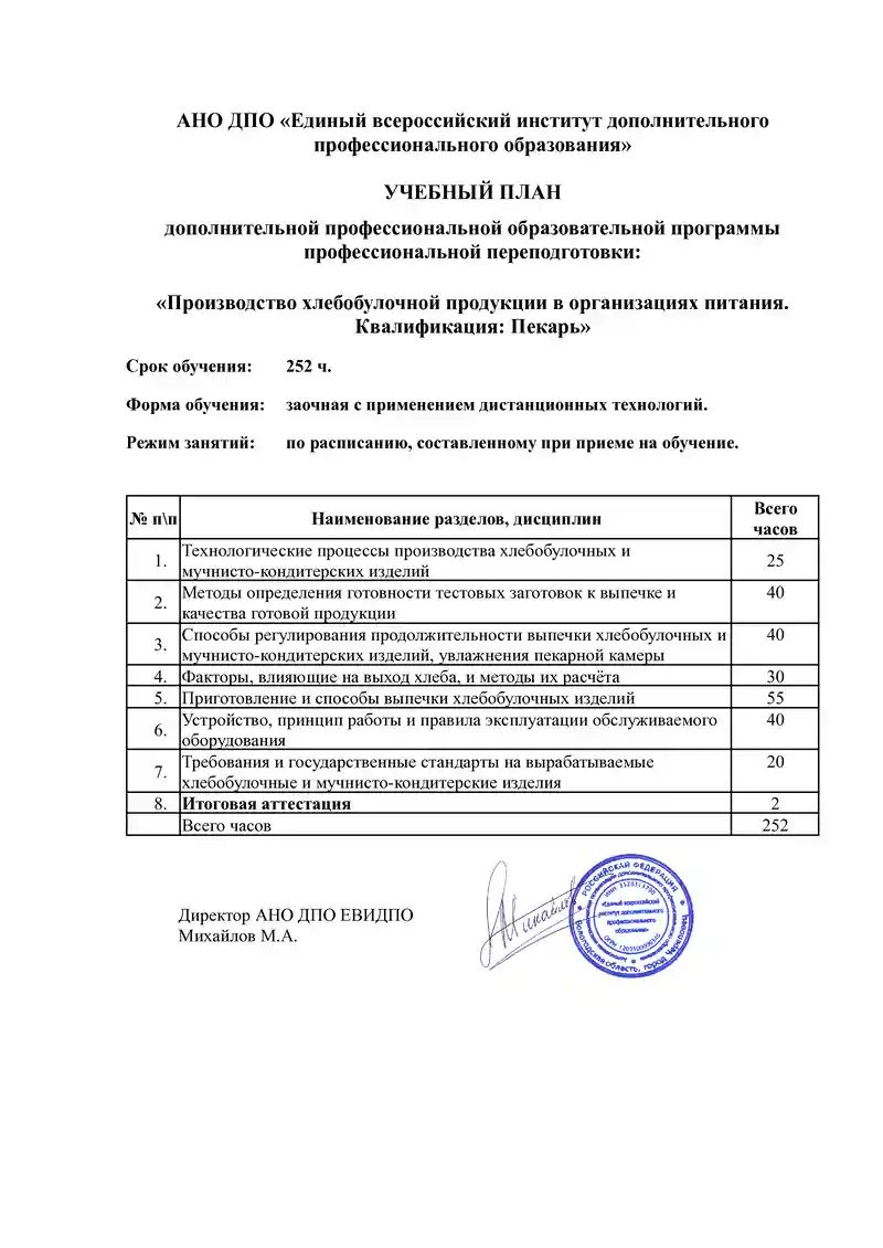 Производство хлебобулочной продукции в организациях питания. Квалификация: Пекарь (252 ч)